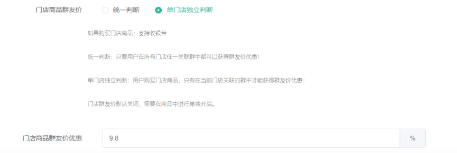 群友价优惠比例:只有门店商品群友价是单门店独立判断才是使用该设置的比例